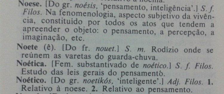 “Noese. Do GREGO noésis, ‘pensamento’, ‘inteligência’. Substantivo feminino. Filosofia. Na fenomenologia, aspecto subjetivo da vivência, constituído por todos os atos que tendem a apreender o objeto: o pensamento, a percepção, a imaginação, etc.”