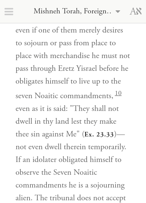 “… he must not pass through Eretz Yisrael before he obligates himself to live up to the seven Noaitic commandments,” e ainda, “if an idolater obligated himself to observe the Seven Noaitic commandments he is a sojourning alien.”