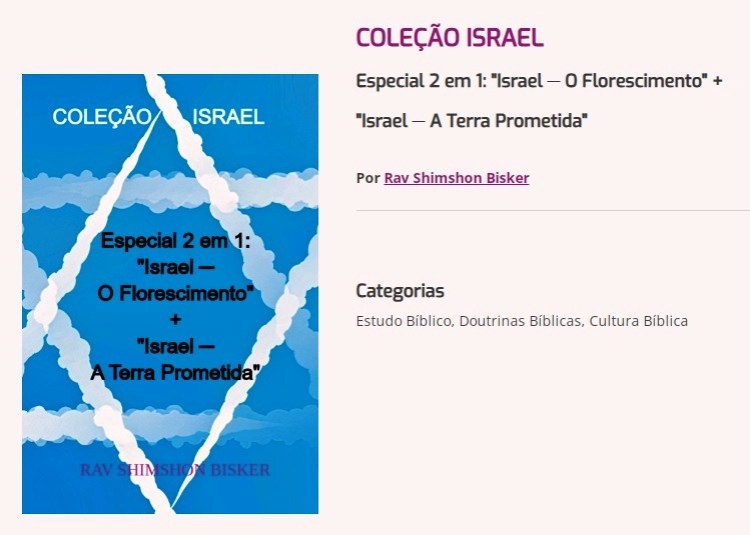 Também vemos no vídeo o Rav falar e mostrar o seu próprio livro: “Israel”. Se você quer aprender sobre o porque Hashem tem um povo e o porque a Terra de Israel é a terra desse povo, então estude Torá adquirindo já esse livro impresso (“COLEÇÃO ISRAEL”). Peça-o diretamente conosco, a Livraria virtual Projeto Noaismo Info, por mensagem de whatsapp no 5511958904394 (lembrando que o envio é estimado em duas semanas, ou seja, o item será encomendado e deve estar preparado para envio dentro de duas semanas a partir da data do pedido, e, além disso, o envio é calculado pela distância (pelo CEP)).