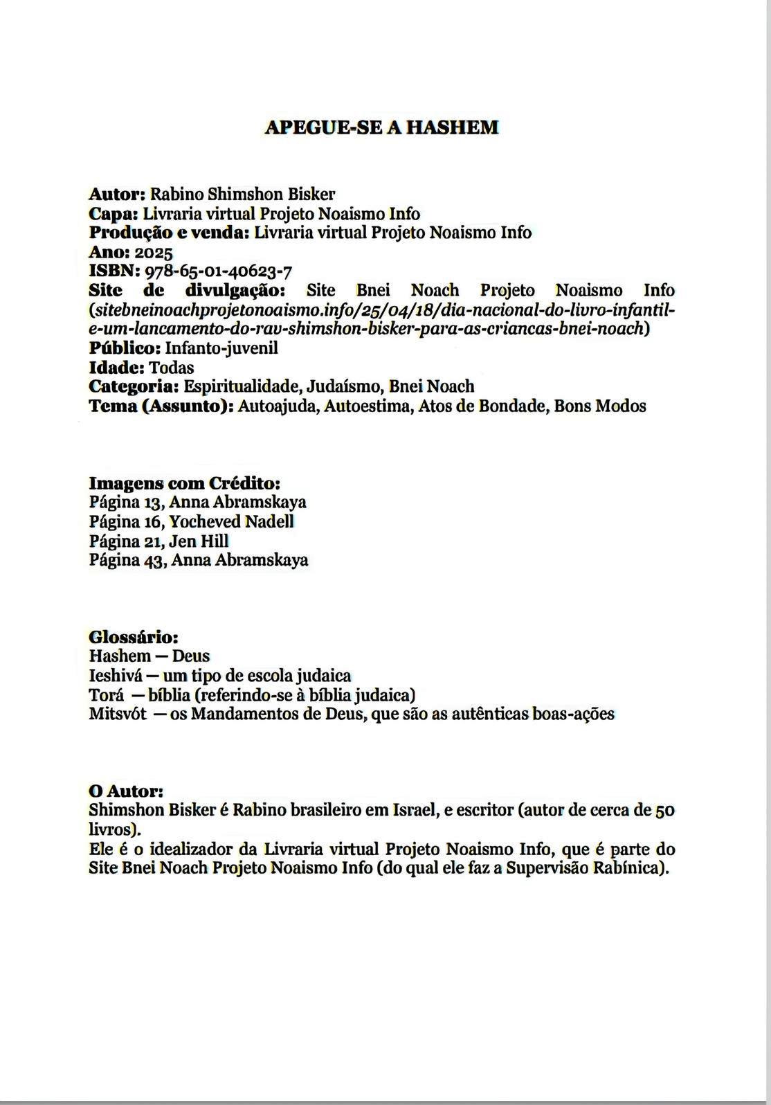 O Rav Shimshon Bisker é um renomado escritor com uma carreira extensa, porém, exceto sua parceria com o Site Bnei Noach Projeto Noaismo Info para a publicação do livro O GUIAZINHO IMPRESSO (1° livro infanto-juvenil Bnei-Noach 100% brasileiro), até então ele ainda não tinha feito um livro para jovens. Mas agora, felizmente, a realidade é outra, graças a D’us! O Rav Shimshon Bisker finalmente preenche a lacuna e escreve o seu primeiro livro infanto-juvenil, e ainda, noaítico (ou seja, para Bnei Noach), mas cuja leitura é recomendada também para judeus, além de indicada também para os próprios adultos.