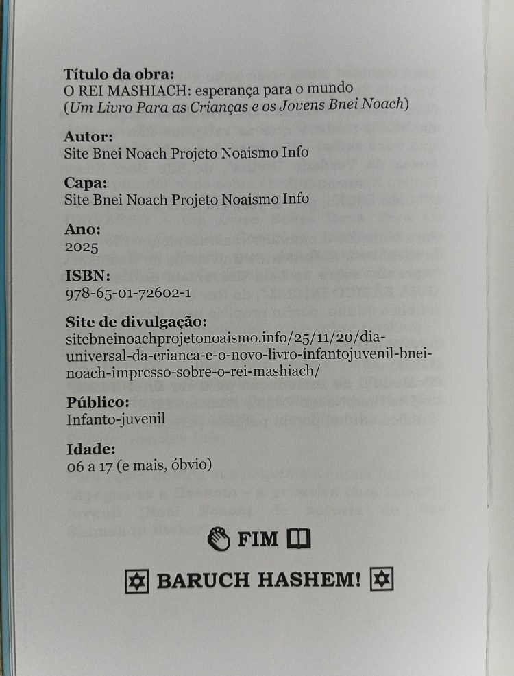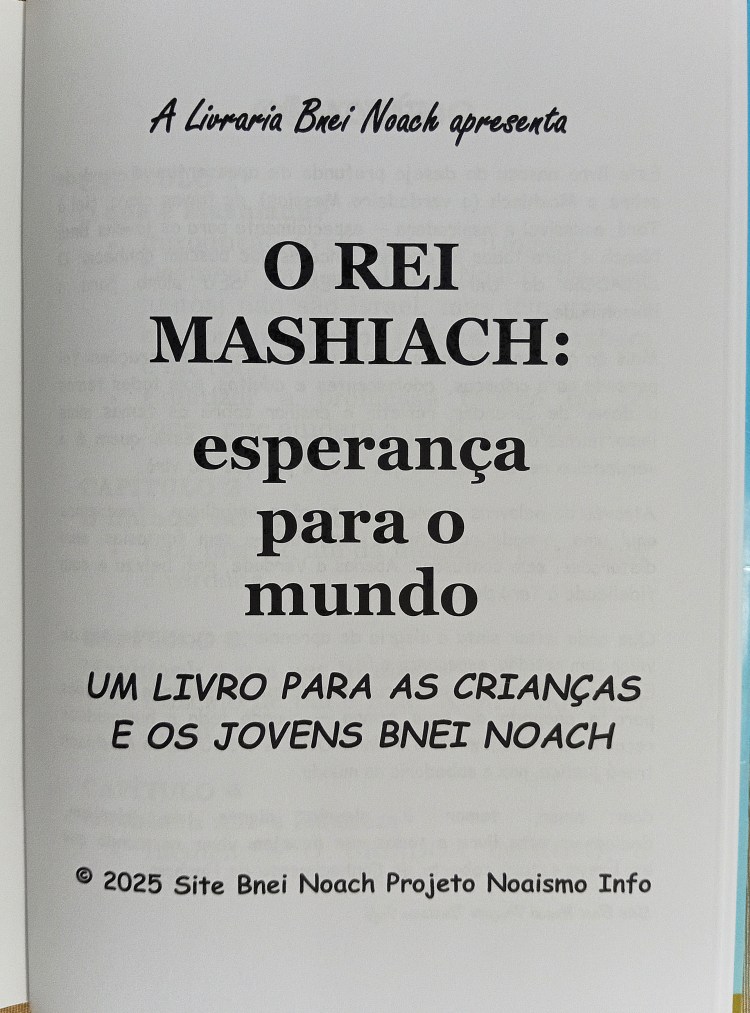 …sim, pois até então ainda não havia no Brasil um livro para jovens Bnei Noach que tratasse unicamente de Deus, Hashem, da mesma forma hoje, 20 de novembro, o Dia Universal da Criança, apresentamos, graças a Hashem, com muita alegria e orgulho, A PRIMEIRA OBRA INFANTO-JUVENIL NOAÍTICA NO BRASIL que trata unicamente do Rei Mashiach, o verdadeiro Messias: