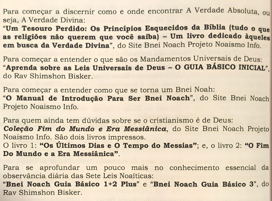 Trazemos agora a explicação de qual é o objetivo de cada um desses livros aqui: Um Tesouro Perdido (do Site Bnei Noach Projeto Noaismo Info), Bnei Noach Guia Básico Inicial (do Rav Shimshon Bisker), e, Manual de Introdução Para Ser Bnei Noach (do Site Bnei Noach Projeto Noaismo Info e Revisado pelo Rav Shimshon Bisker).