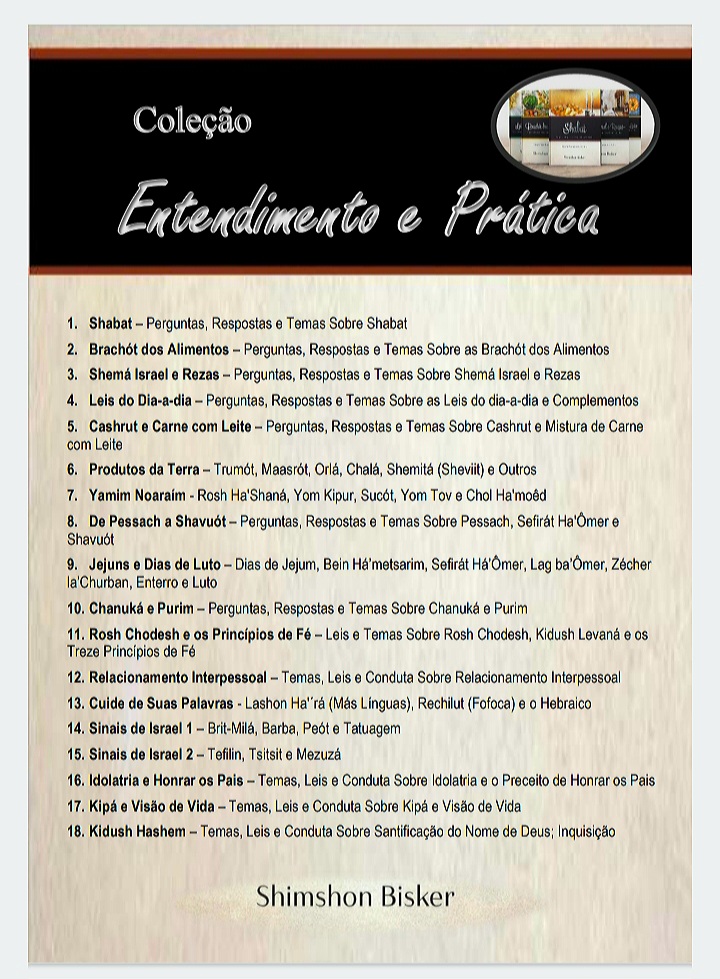 Nesta Coleção tratamos de: o significado e a influição das cores em nossas vidas; A origem da força das pedras e a sua influição em nosso mundo; Meditação: a meditação correta e verdadeira, ou seja, conforme a Torá; Explicação sobre o mundo espiritual e os seres espirituais de forma abrangente, organizando o tema para evitar uma enorme confusão existente pelos mal-entendidos e falsas informações espalhadas pelos meios de comunicação, com os temas: entidades que acompanham a pessoa antes e após a morte; seres semi-espirituais; um caso impressionante de uma pessoa que mexia com entidades espirituais; a entidade responsável de cada povo; almas e anjos; estudo dentro dos versículos sobre as Leis relacionadas ao uso das forças de impureza, e vários outros temas.